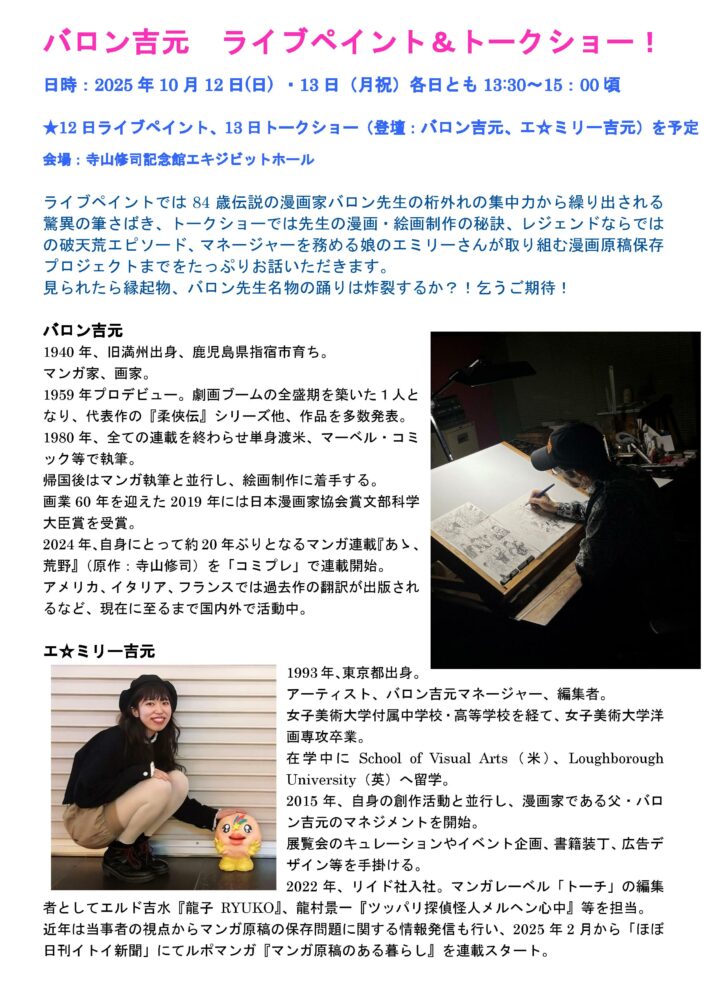 寺山修司の長編小説「あゝ、荒野」を原作とし、2024年、劇画家バロン吉元が20年ぶりの漫画連載を開始。そのコミックス1巻目の刊行を記念し、バロン吉元漫画「あゝ、荒野」の直筆原稿を展示いたします。